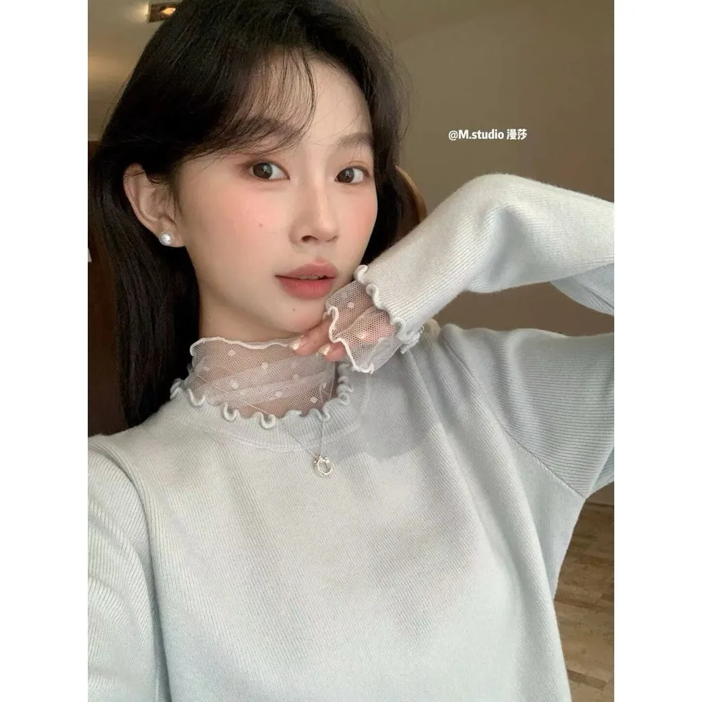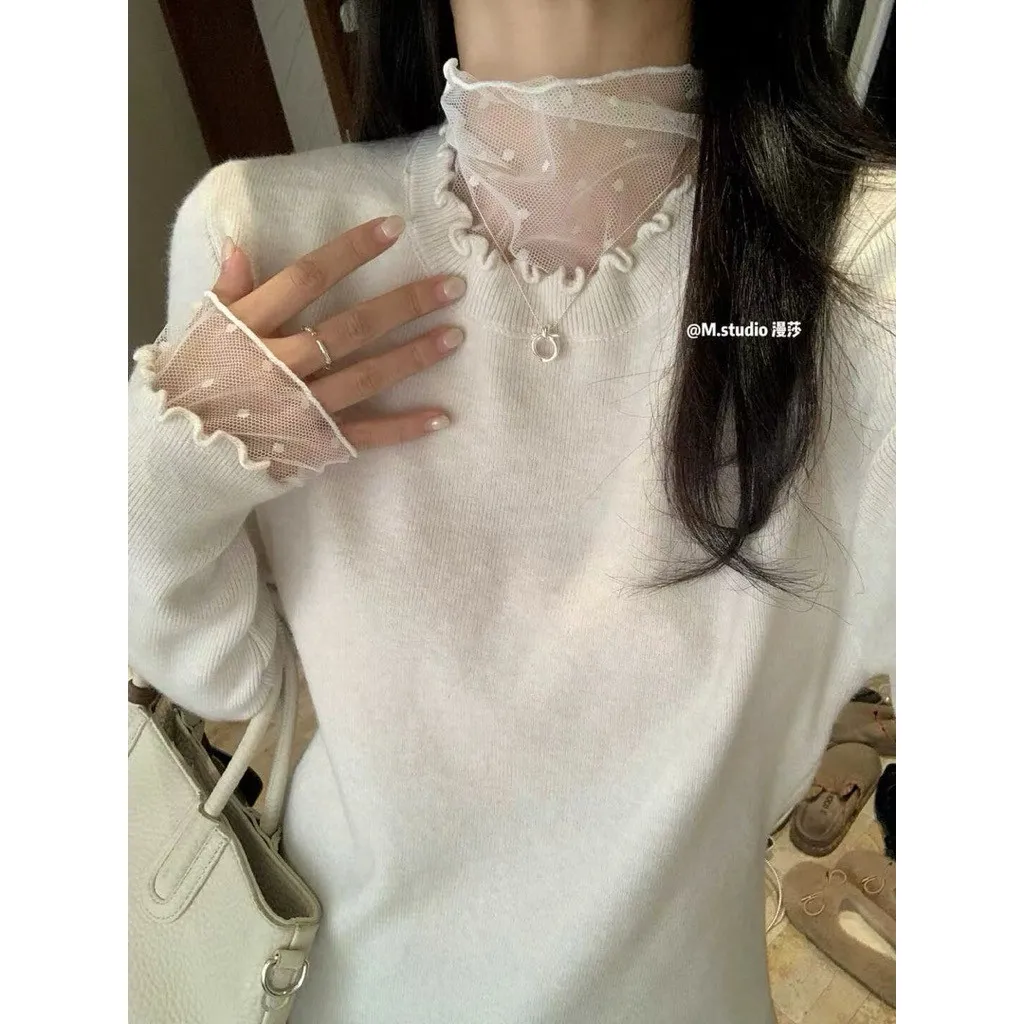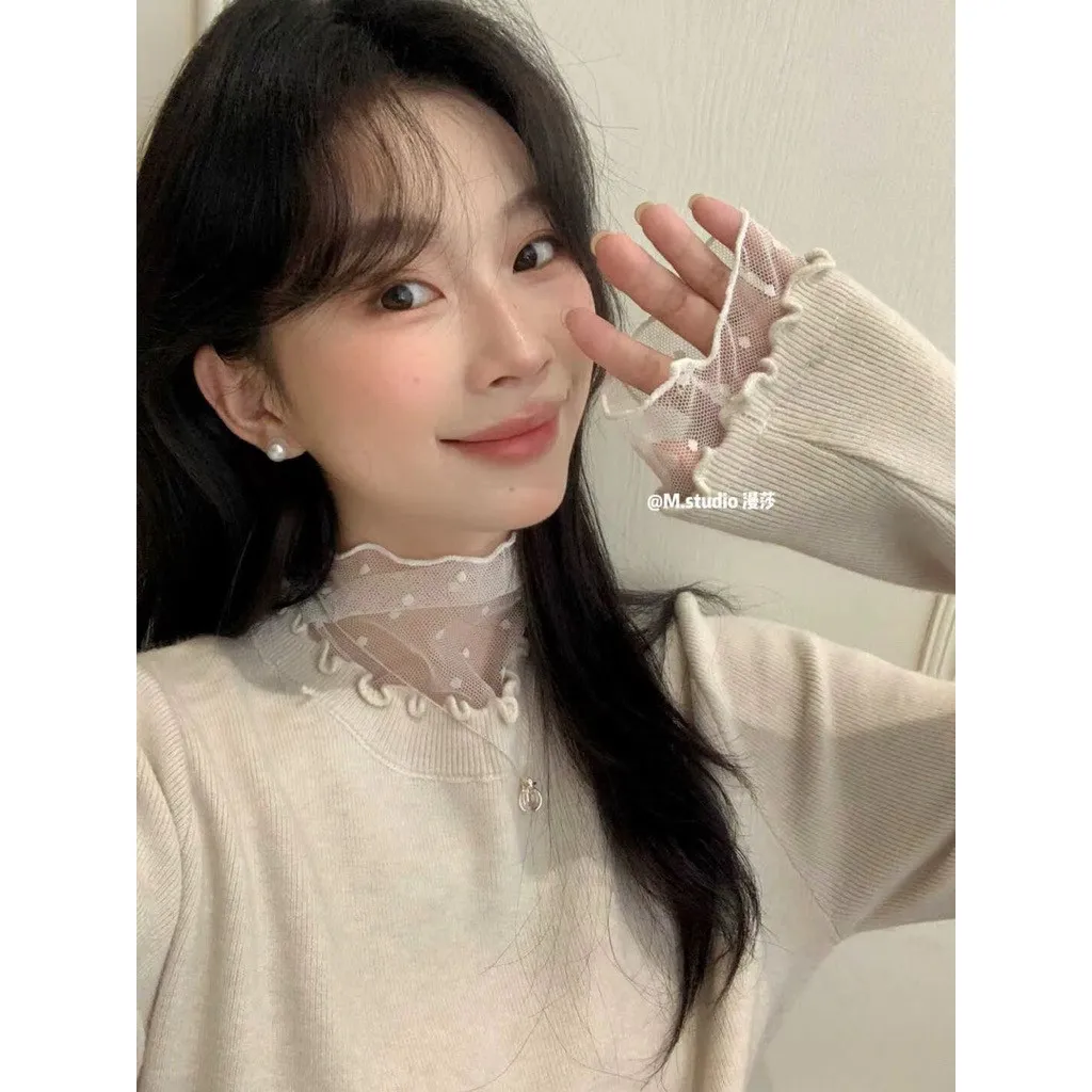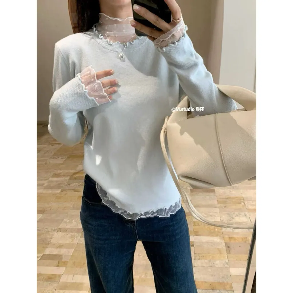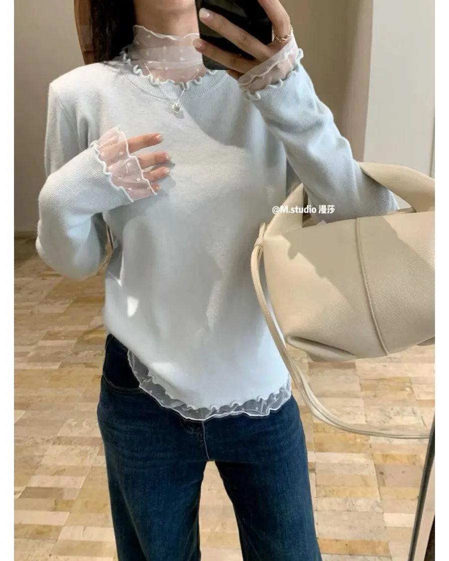 現貨 假兩件式木耳邊+點點蕾絲內搭上衣
