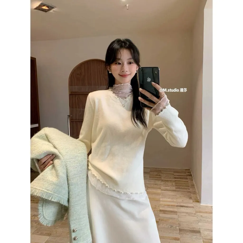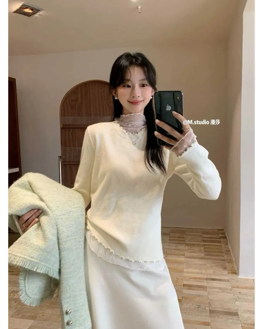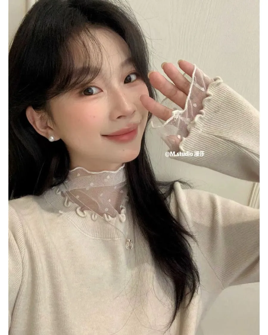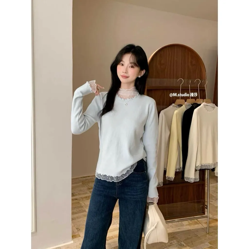 蕾絲拼接木耳滾邊好好看,搭長褲長裙都甜美