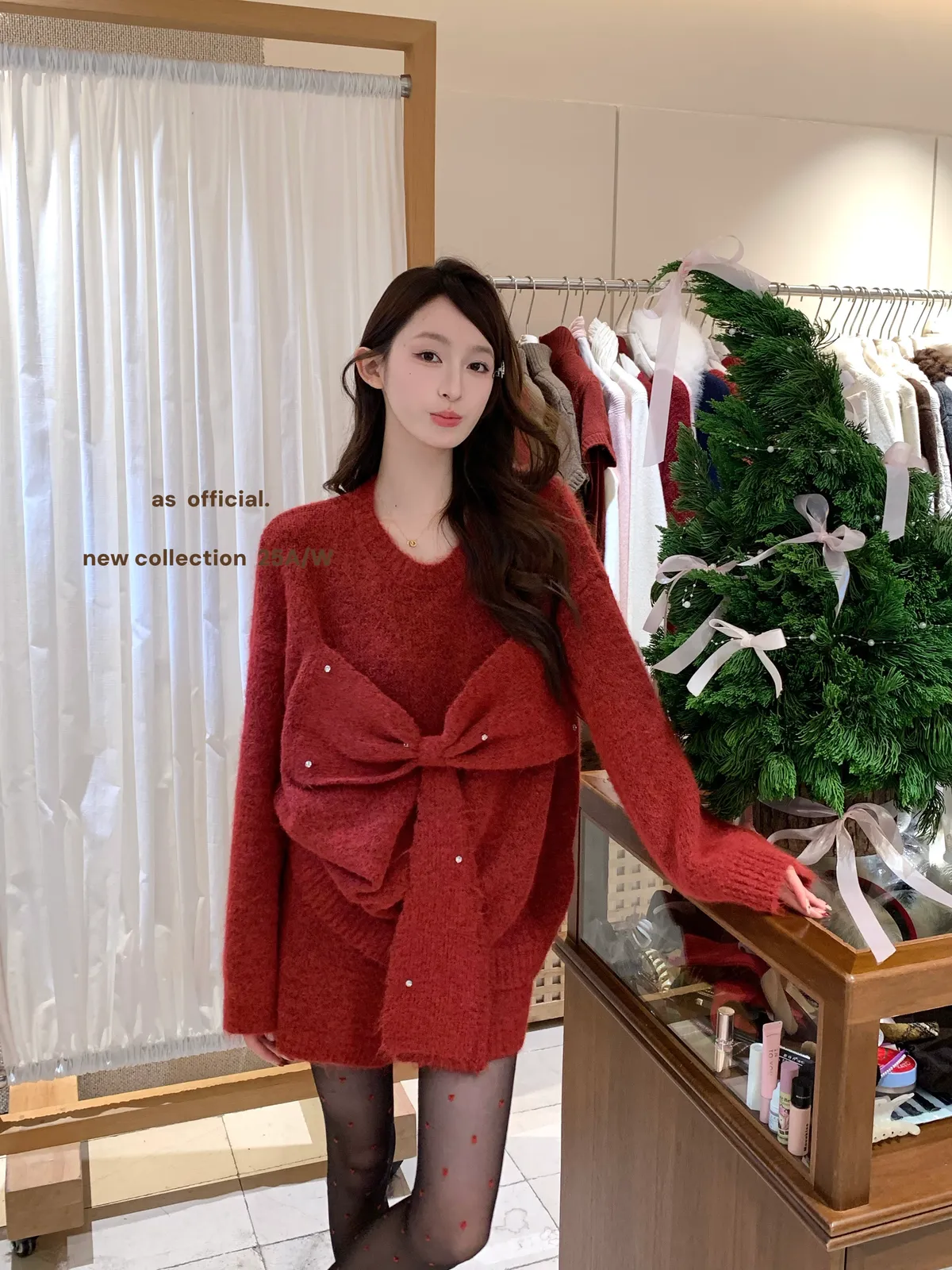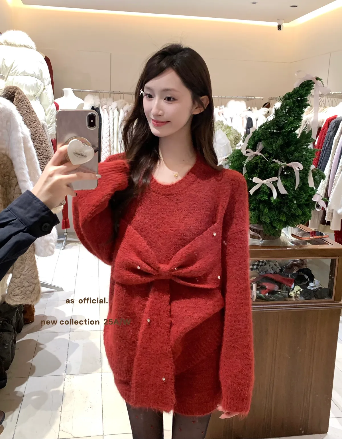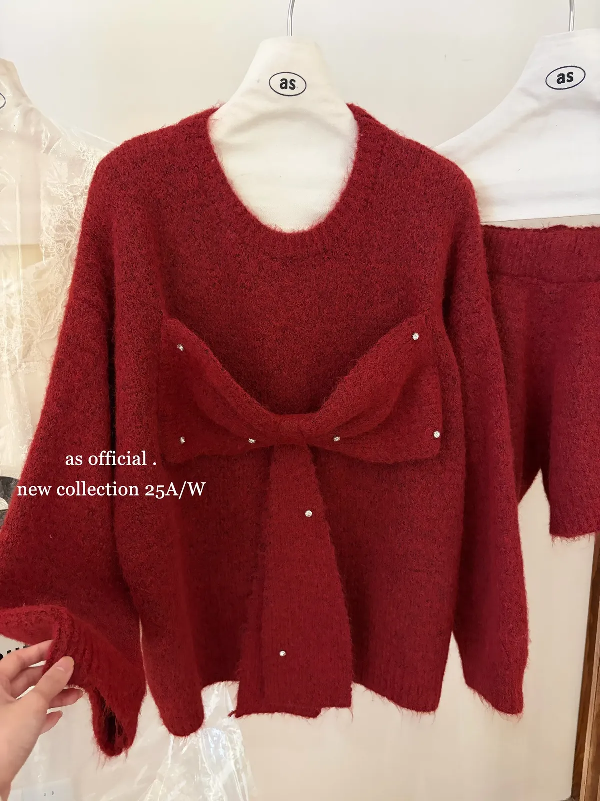 新年紅色套裝 貼鑽大蝴蝶結針織毛衣+針織褲