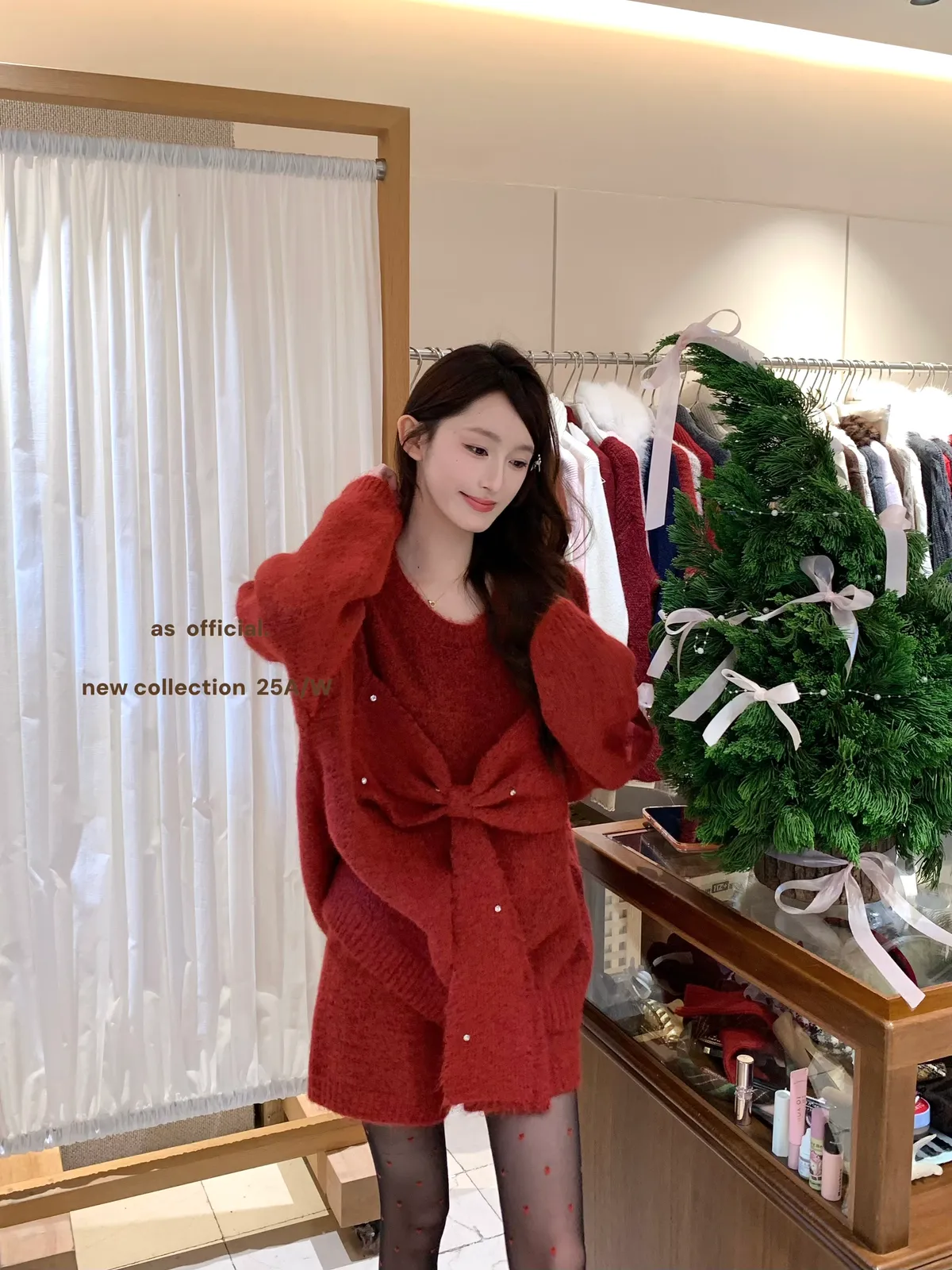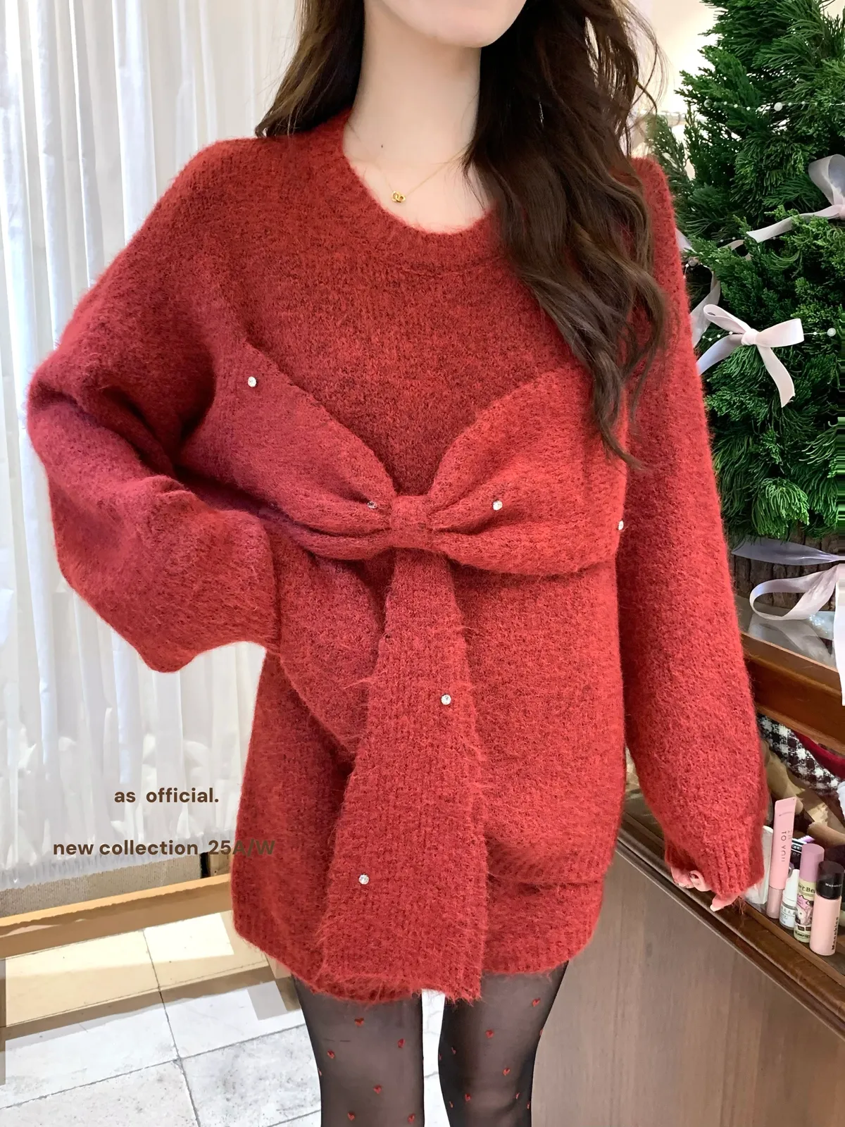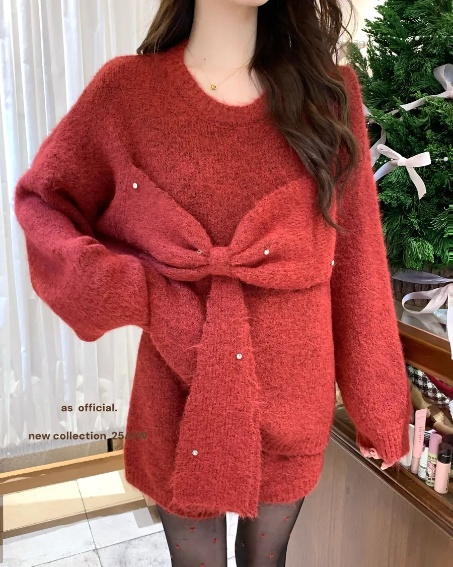 新年紅色套裝 貼鑽大蝴蝶結針織毛衣+針織褲