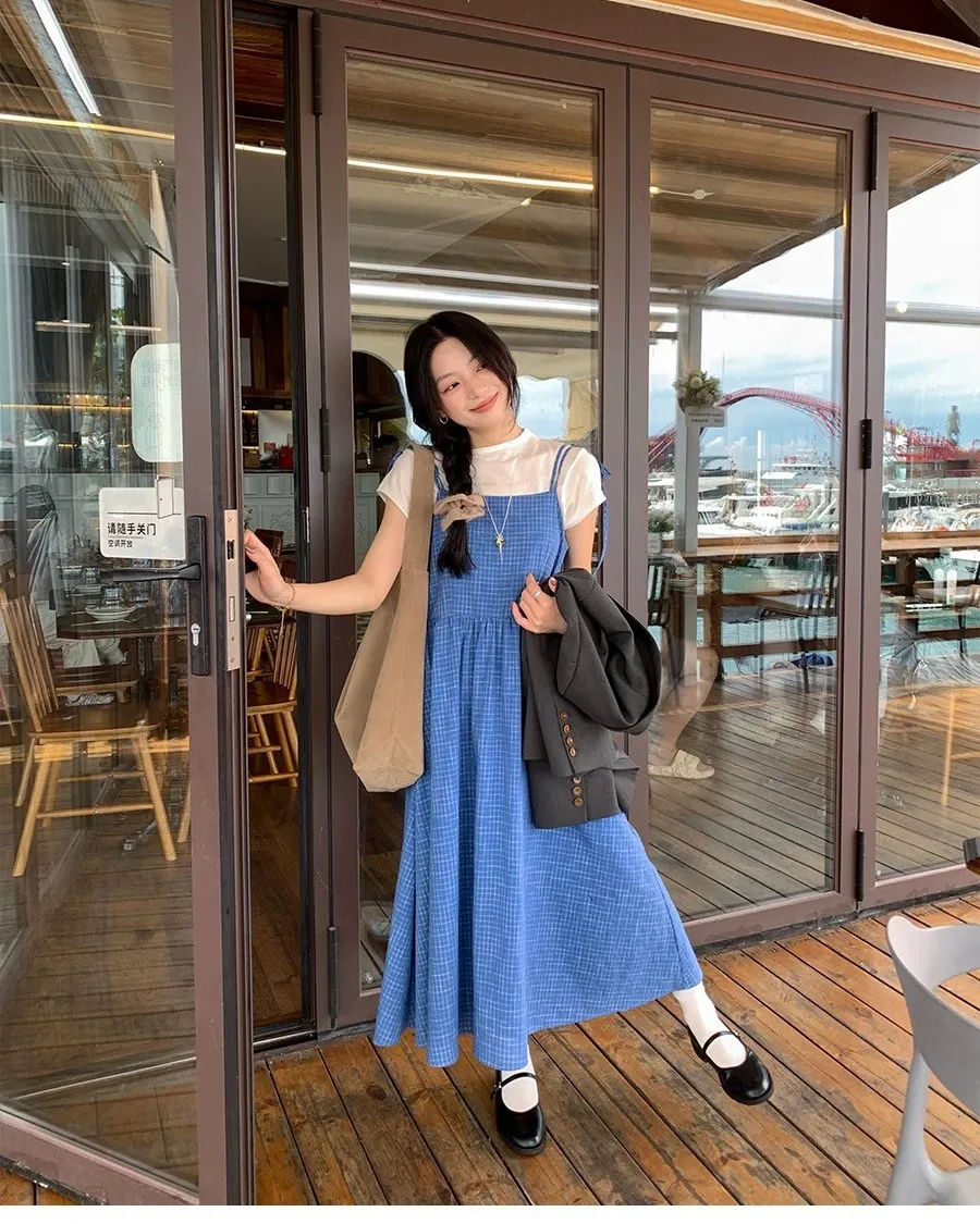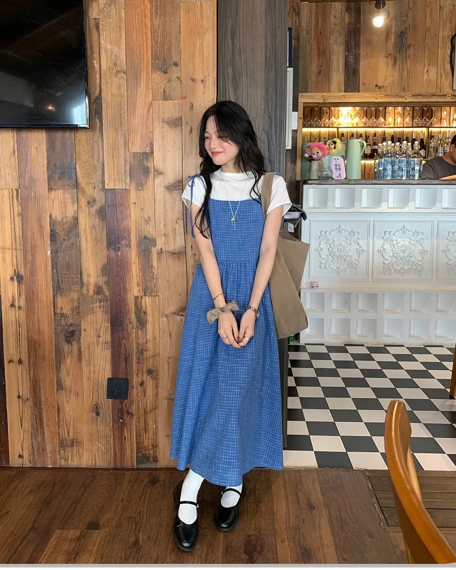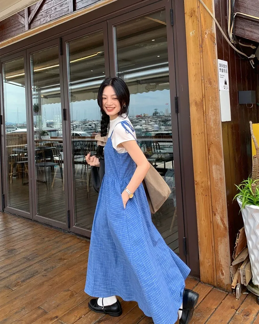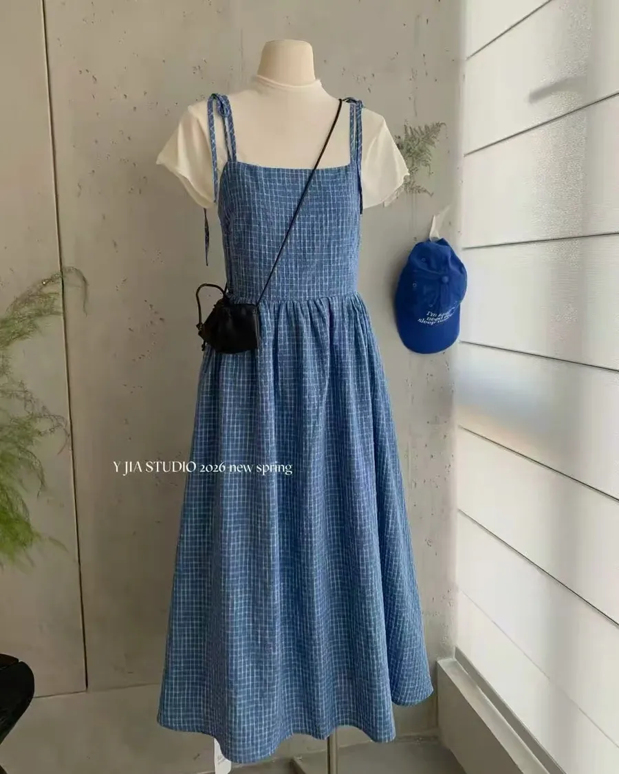 渡假休閒風格子吊帶綁帶洋裝